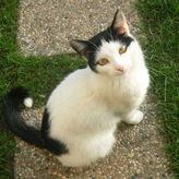 Aussehen: weiß mit schwarzen Flecken, gelb-grüne Augen